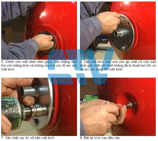 - Khi thay đổi áp lực nước, các khối không khí trong ruột bình sẽ nở ra. Cần cài đặt áp lực của đồng hồ và rơ le theo đúng yêu cầu của nhà sản xuất để tránh ruột bình rạn nứt đột ngột do thay đổi áp lực.
